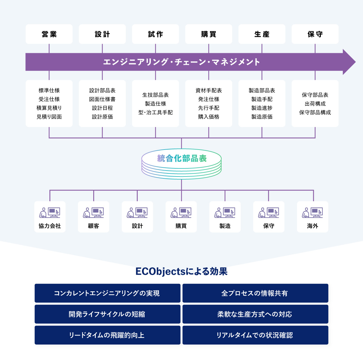 ECObjectsの基となるECMは、製造業における受注・設計・試作・購買・生産のプロセスを情報共有と情報配信を推進することにより、シームレスに結合し、全体最適と製品開発競争力の向上を実現するコンセプトです。