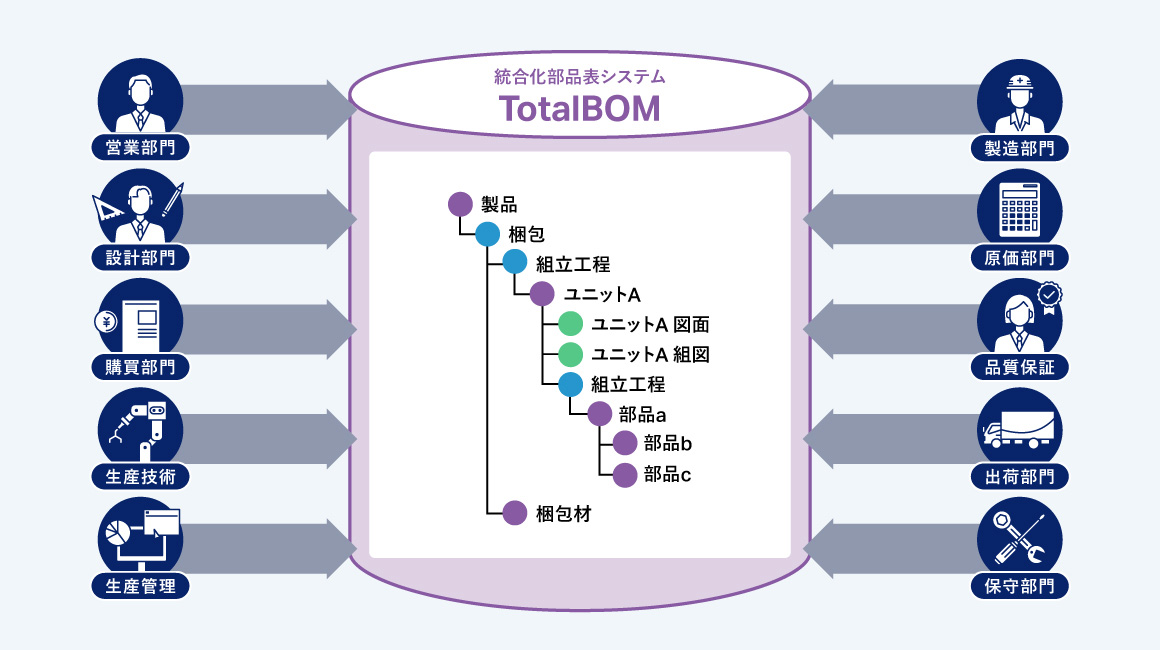 TotalBOM(統合化部品表)は、部品表の基本機能に加え、部門や拠点ごとの部品表を統合する「統合化部品表」の機能を有している点が大きな特徴です。