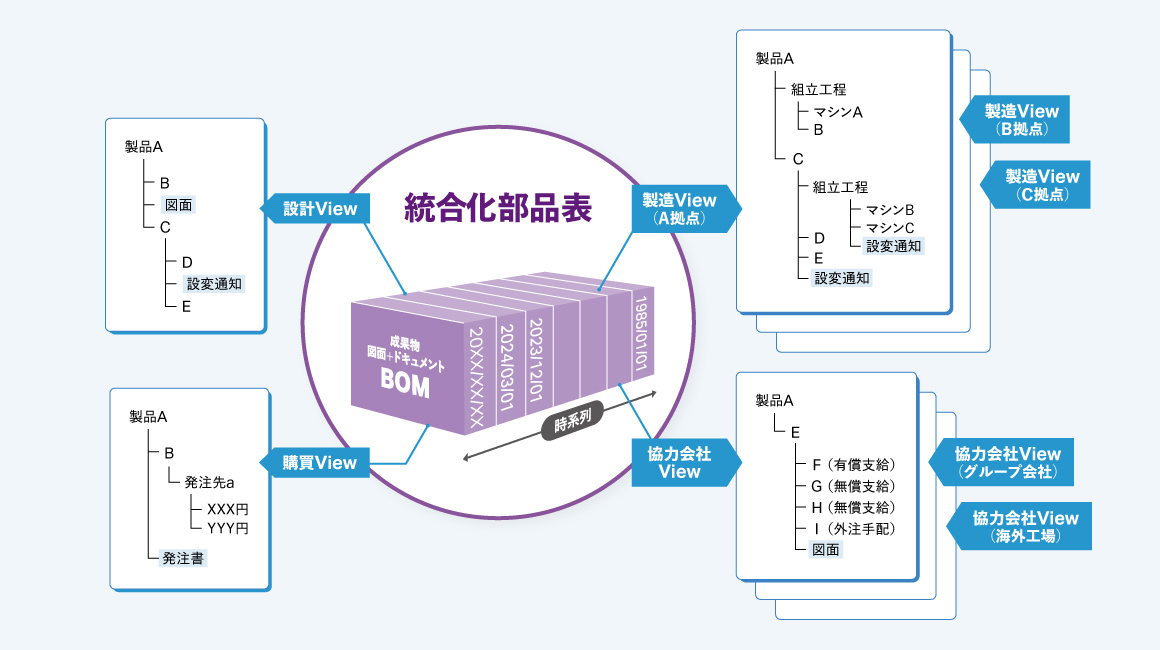 モノづくりに必要な技術・生産情報を統合化して全体最適を実現しながら、部門毎の特性のある技術・生産情報も履歴管理します。